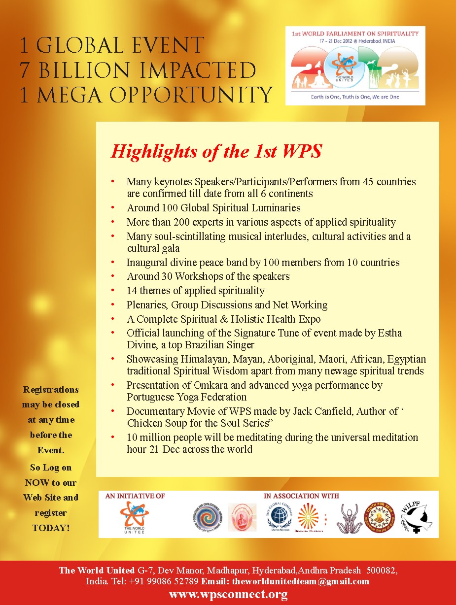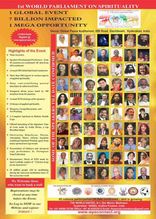 The 1st World Parliament on Spirituality 17th Dec – 21st Dec 2012 at The Global Peace Auditorium, Gachibowli, Hyderabad – India. It was organized by The World United.